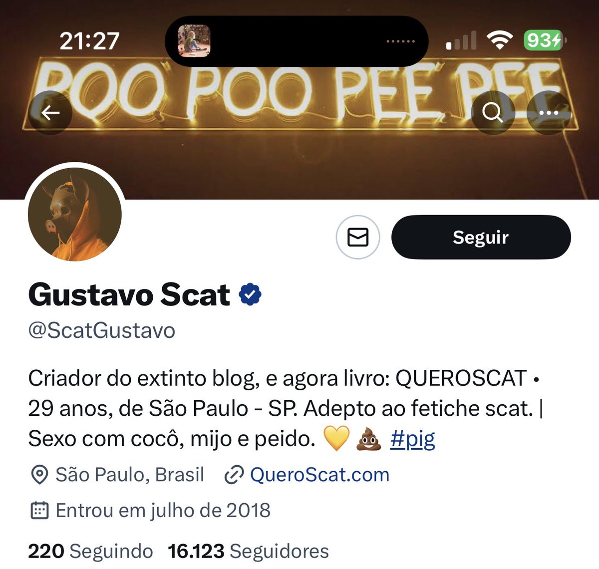 Em sua conta, Gustavo compartilha vários vídeos de bosta e até mesmo pessoas fazendo relações sexuais com merdas.