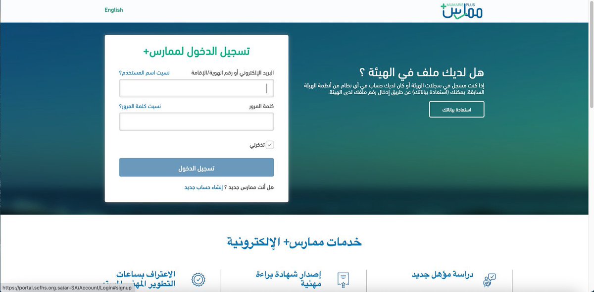 1- نتوجة لموقع ممارس+ في حال وجود حساب نسجل دخول اذا كان اول مره راح نروح عند إنشاء حساب جديد ونعبي البيانات.