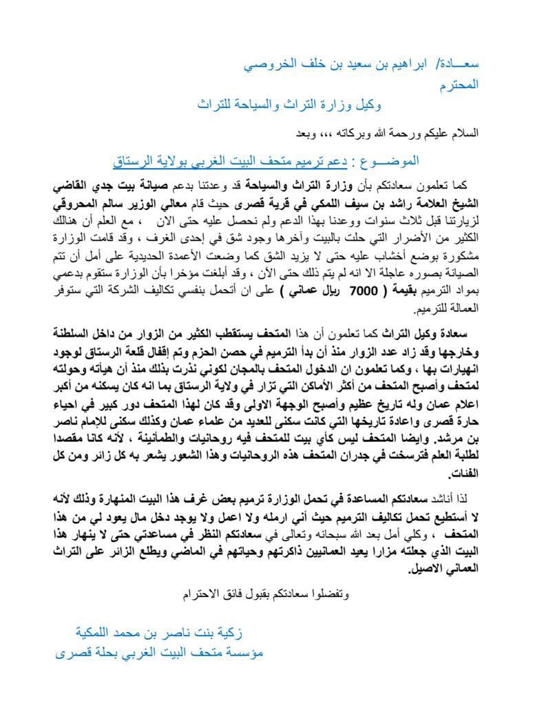 ولقد كتب  القائمين على ذلك المتحف العُماني المميز في خطاباتهم للمحروقي بأن المتحف يحتاج لضرورة الترميم، وأن بعض جدرانه متشققة، وأنهم يخشون أن الأمور المتعلقة بصيانة المتحف تزداد خطورة.