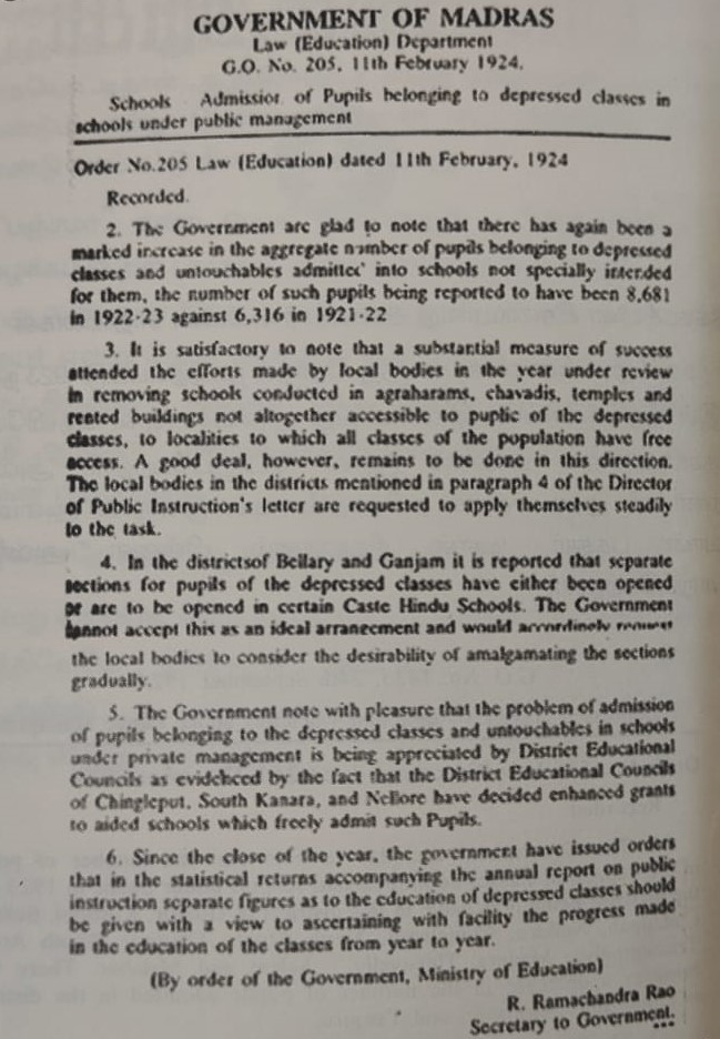 பள்ளிகள் துவங்கப்பட்டன. பள்ளி இறுதித் தேர்வுக்கு பட்டியலின மாணவர்கள் பணம் செலுத்தத் தேவையில்லை என அறிவிக்கப்பட்டது. கல்லூரிகள், உயர்நிலைப் பள்ளிகளில் பிற்படுத்தப்பட்ட மாணவர்கள் அரைச் சம்பளம் கட்டினால் போதுமென உத்தரவிடப்பட்டது. (9/11)