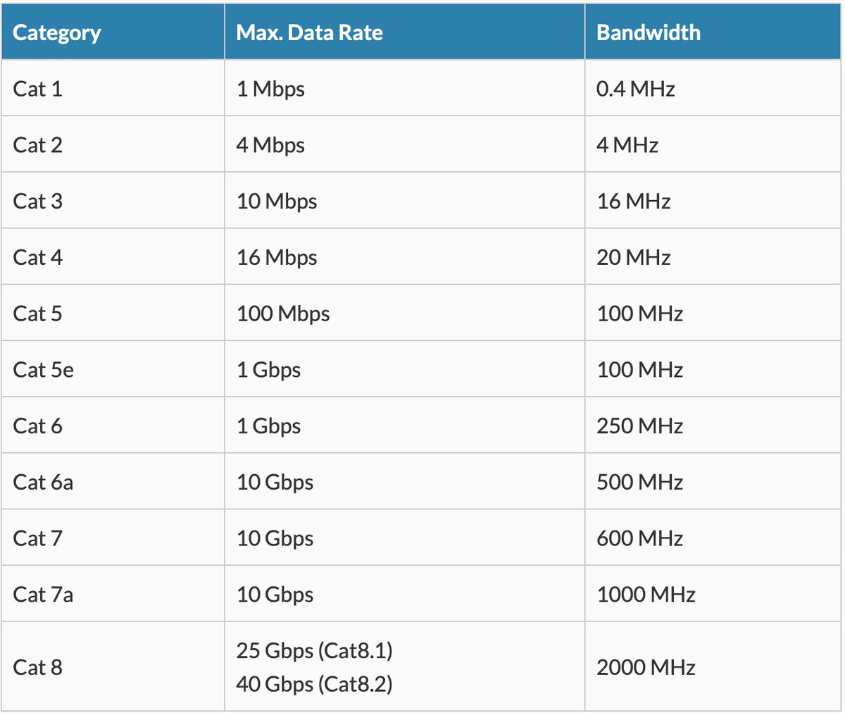 غالبا المتوفر في الاسواق انواع CAT 5 وما فوق ويدعم CAT 5سرعة 100 Mbps بينما يدعم CAT 8 سرعة 40 Gbps. مع الاشارة إلى انه هذه السرعة ليست مضمونة بل ( up to) حيث تعمد سرعة الشبكات السلكية هنا على عوامل منها سرعة الراوتر ونوع الكيبل المستخدم ..