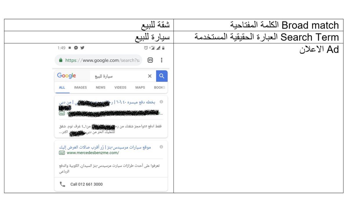 فمثلا اعرض امامكم مثال حقيقي قمت فيه بالبحث عن: سيارة للبيع ،ظهر فيها اعلان لشقة للبيع، والسبب ان المعلن في الغالب استخدم جملة مفتاحية: شقة للبيع