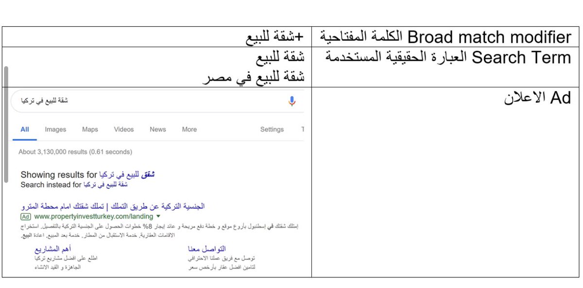 الى هنا لا توجد مشكلة ولكن في هذا النوع تحديدا لا يلتزم جوجل ابدا بالكلمات المفتاحية كما يدعي، بل انه يقوم باظهار اعلانك على كلمات لم تستخدمها قط لمجرد وجود تشابه من وجهة نظر جوجل و طبعا تقوم جوجل بذلك لعرض اعلانك بشكل اكبر للحصول على اكبر عدد من النقرات بغض النظر ان كانت مفيدة…