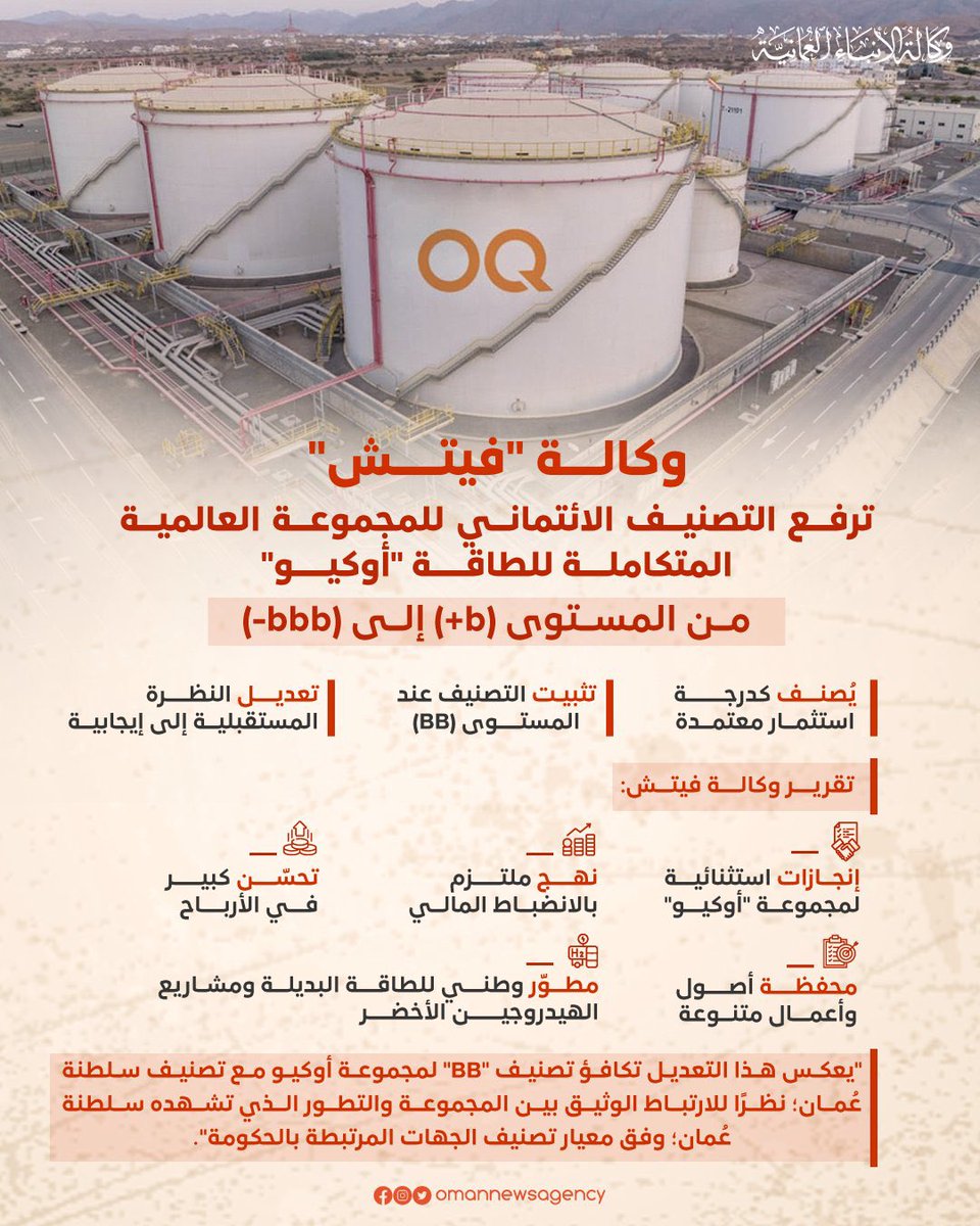 #وكالة_فيتش ترفع التصنيف الائتماني للمجموعة العالمية المتكاملة للطاقة #أوكيو من b+ إلى bbb - وتعد أكيو من أبرز الشركات الحكومية في #سلطنة_عُمان