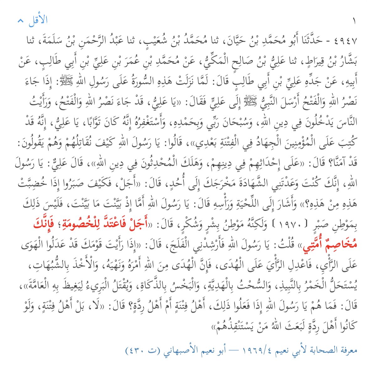 يَا عَلِيُّ إِنَّكَ مُبْتَلًى وَ مُبْتَلًى بِكَ وَ إِنَّكَ مُخَاصِمٌ فَأَعِدَّ لِلْخُصُومَةِ.