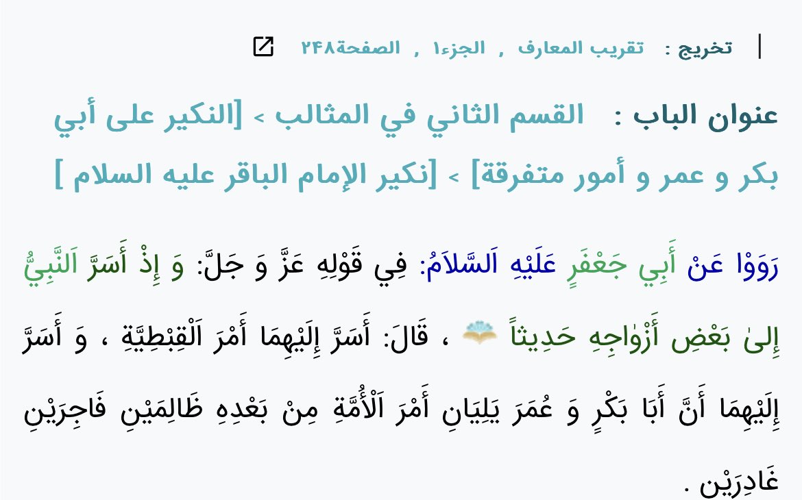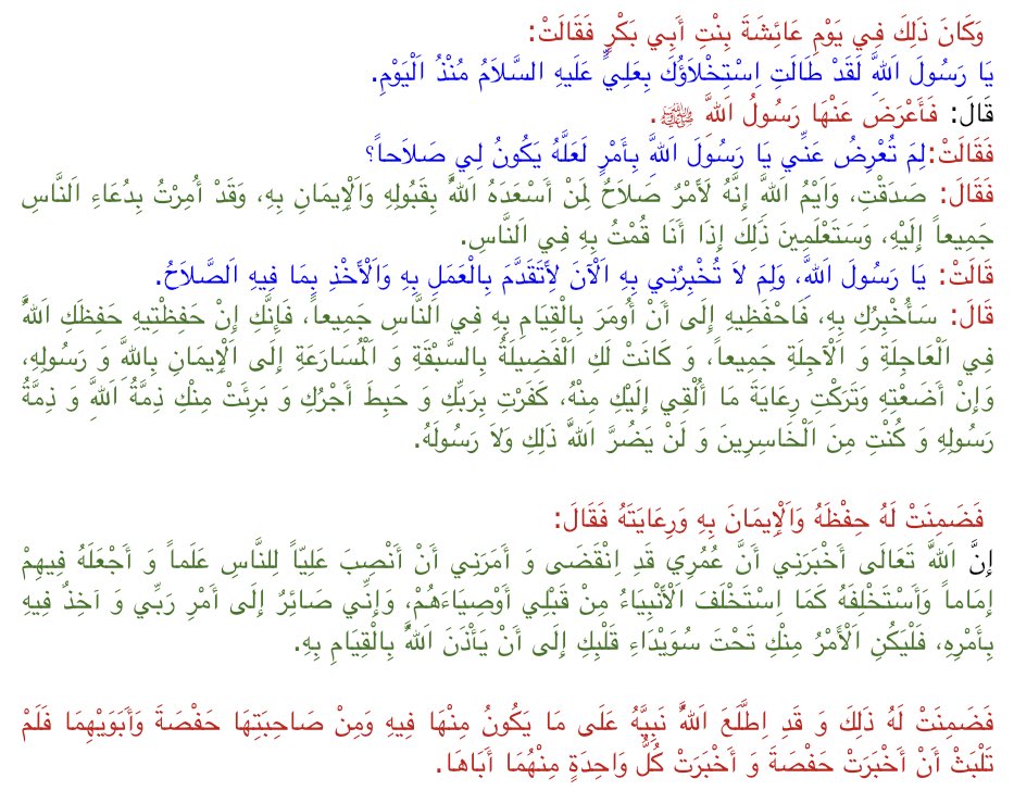 • فَأَعْلَمَنِي أَنَّ أَبَاكِ يَلِي الْأَمْرَ مِنْ بَعْدِهِ، وَأَنَّ أَبِي يَلِيهِ بَعْدَ أَبِيكِ، وَقَدِ اسْتَكْتَمَنِي ذَلِكَ فَاكْتُمِيهِ
