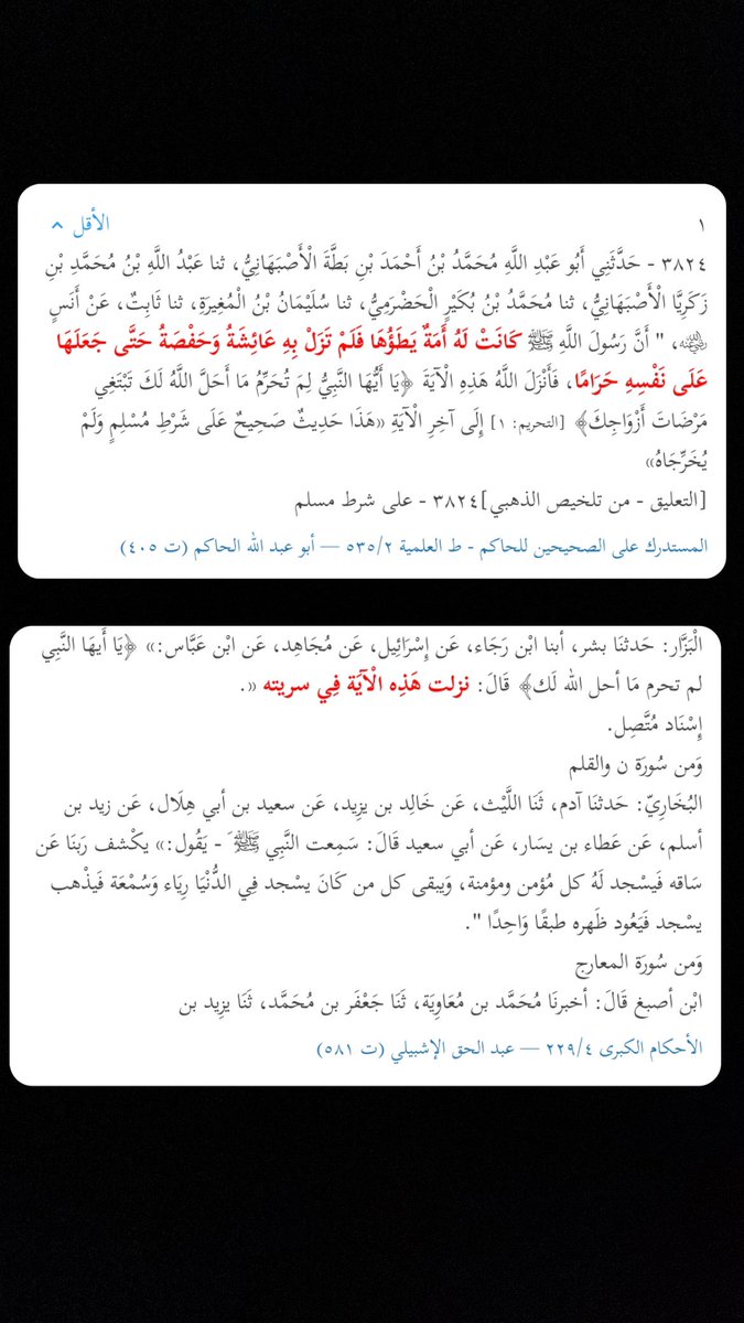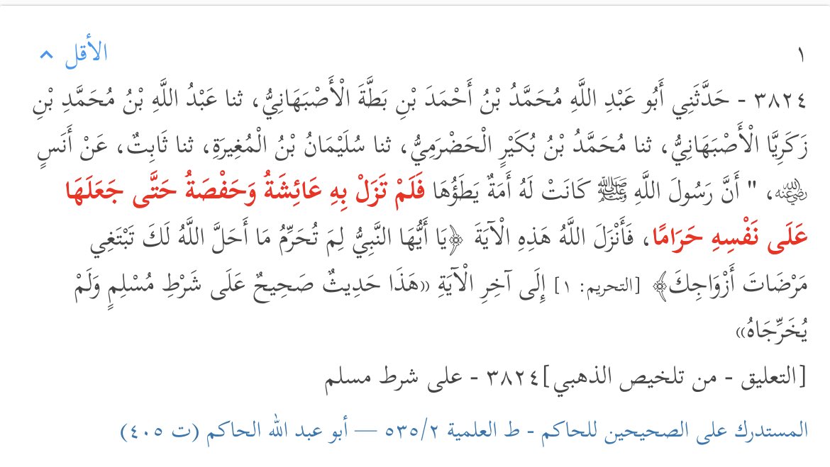 وهذه القصة تتناسب مع ما ورد في تفسير سورة التحريم أن سر النبي ﷺ هو في أمر الخلافة، لكن قبل إيراد المؤيدات والشواهد لذلك، سنُبين ما هو الأمر الذي حرمه النبي ﷺ على نفسه، لأن هناك خلطاً بين هذا الأمر وبين ما أسره النبي ﷺ.