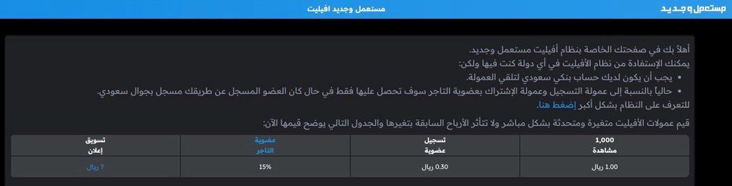 بعد التسجيل بيطلع لك نظام التسويق بالعمولة "مستعمل وجديد افيليت" ، وبكذا تقدر تنشر اي اعلان موجود عندهم بتكسب من المشاهدات وغيرها.