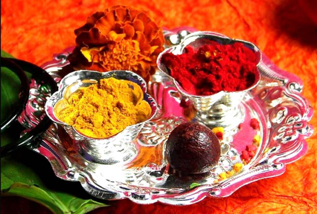 12- कुमकुम/सिंदूर और हल्दी :- कुमकुम जो चूने या नीबू के रस में हल्दी को मिलाकर बनाया जाता है, त्वचा का शोधन और मस्तिष्क स्नायुओं का संयोजन करता है। हल्दी में खून को शुद्ध करने, शरीर की त्वचा में निखार लाने, घाव को ठीक करने और अनेक बीमारियां दूर करने का गुण होता है। इसलिए यह एक…