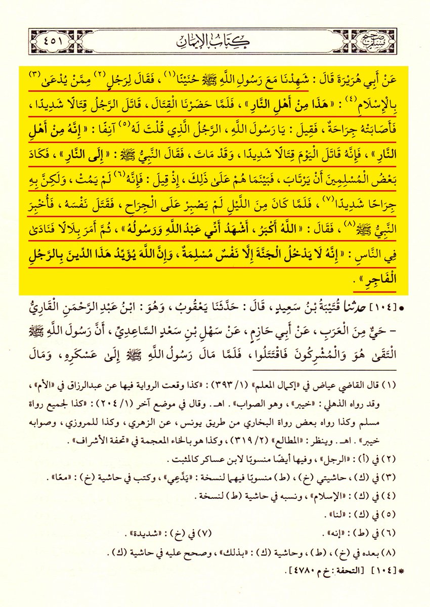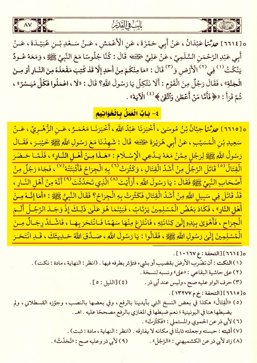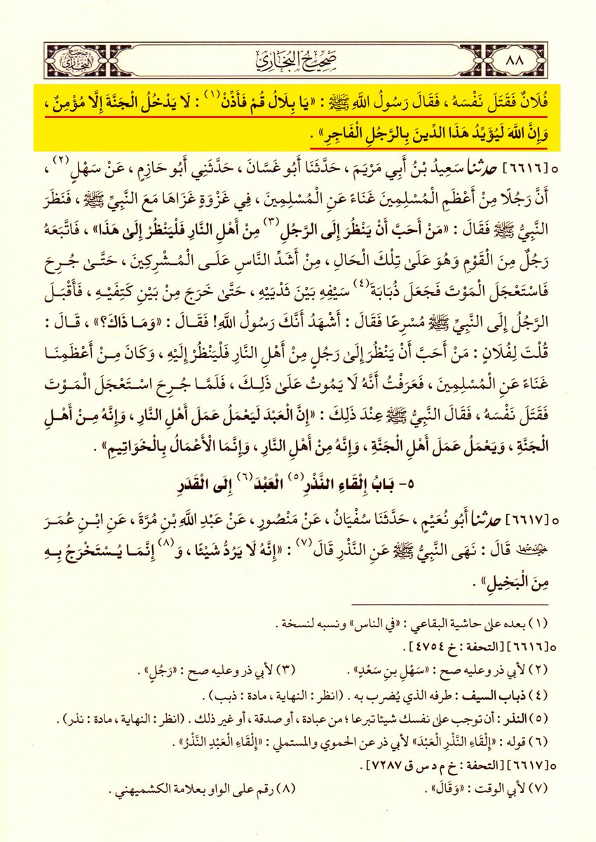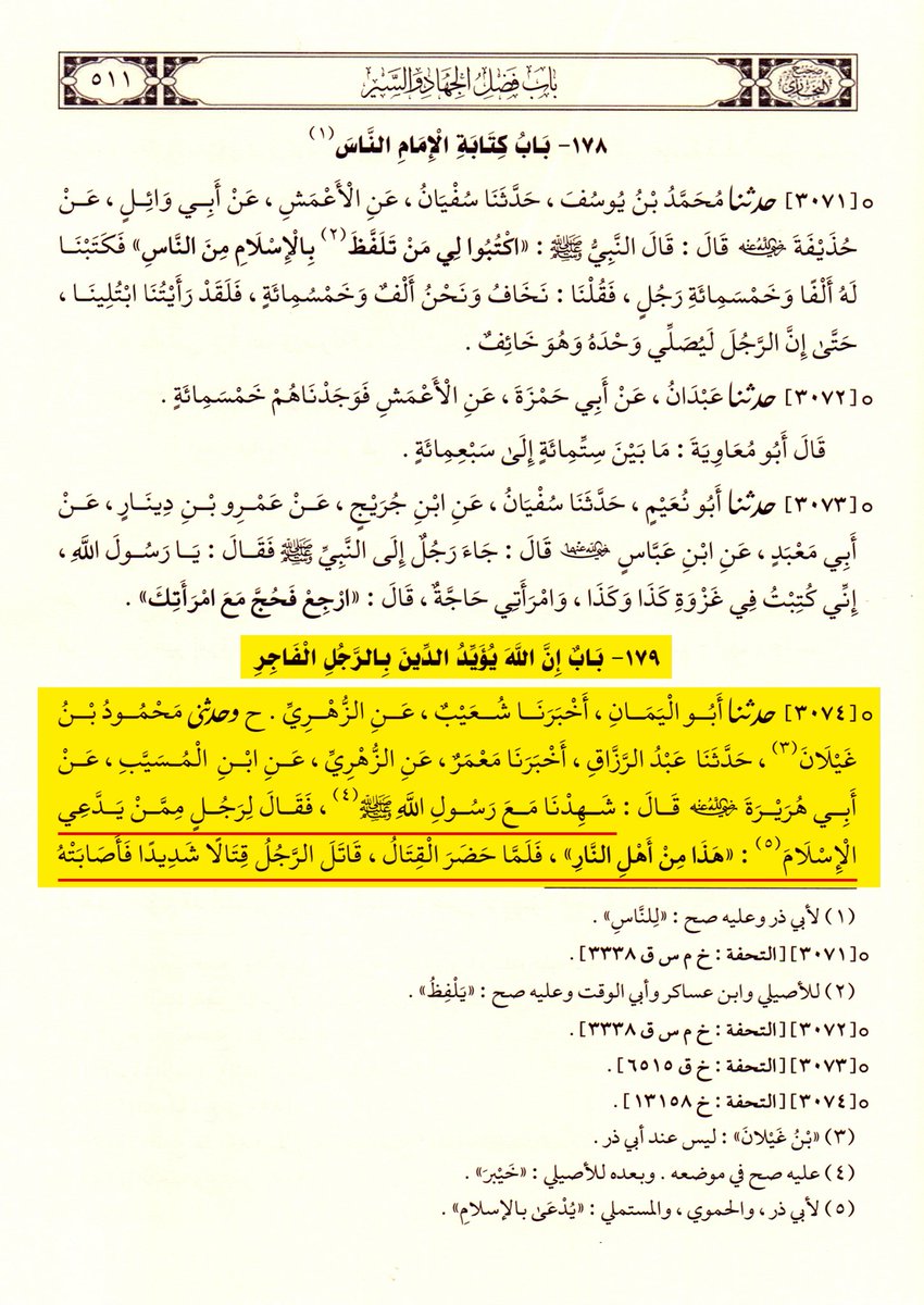 وكرّر البخاري الرواية في صحيحه في باب العمل بالخواتيم، فكيف يدَّعي العريبي أنها موضوعة لتحسين فعل الفجّار وتلميع الاستعانة بالفجور والسفهاء وتوسّل نصرة الدين الملعوب به بطرائق الشرور ومساخط الإله وجعل البر مع الفاجر في خندق واحد وميزان واحد؟! 👇🏻