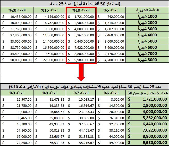استثمر 50 ألف دفعه واحدة في ثاني سنه له بالوظيفة بعمر 25 سنة و بعدها صار يستثمر 7 ألف شهري لمدة 25 سنة حتى وصل عمر 60