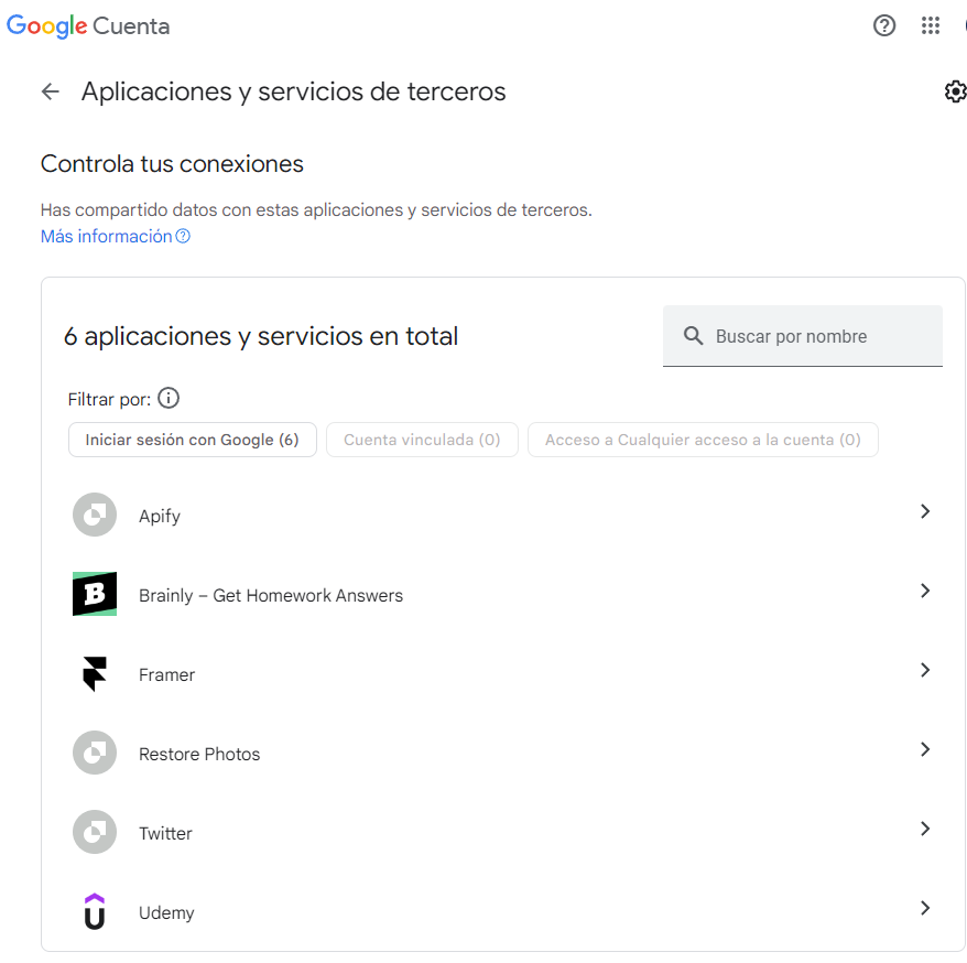 5⃣ En esta ocasión, les muestro como quitarle esos permisos o accesos. Google tiene una opción denominada "Aplicaciones y servicios de terceros", la cual nos muestra todas las aplicaciones conectadas.