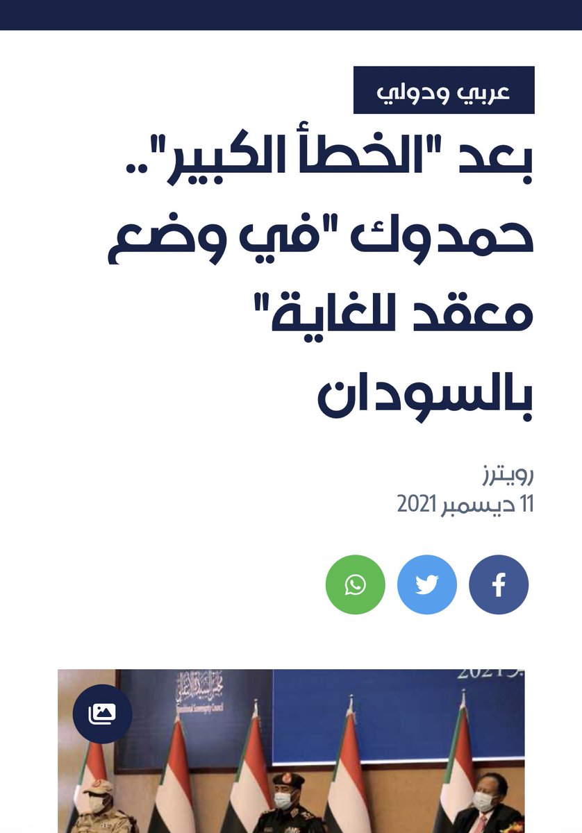 حمدوك هو كمان فهم ان بقاء الغاضبين في الشارع ورقة ضغط قوية تساعدعلى بقاءه اطول فترة ممكنة مش بس مدةالحكومة الانتقالية المقررة لسنتين
