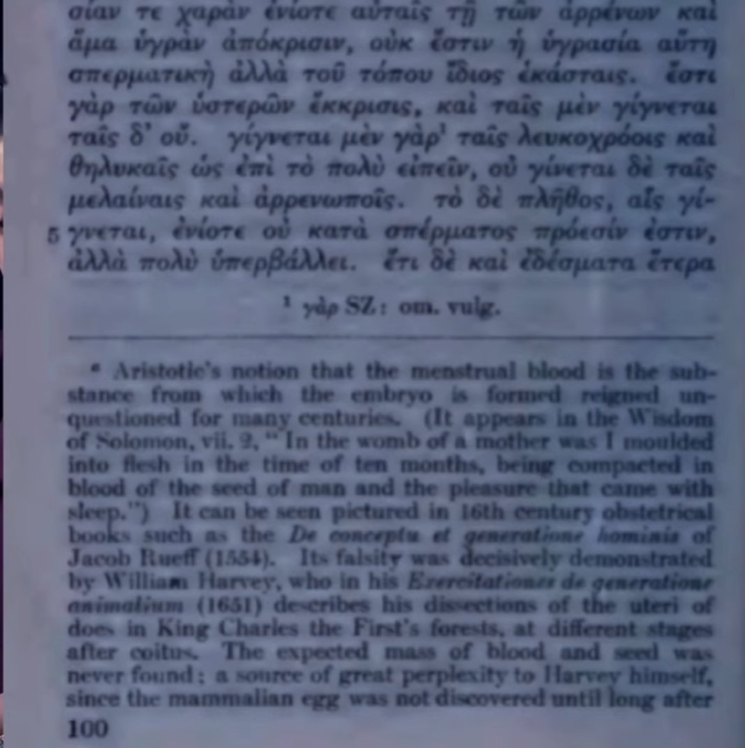 الجنين هو دم الحيض وقال ان فكرة ارسطو تلك استمرت لعدة قرون من دون ان تتعرض للنقض ووهذه الفكرة تم اثبات زيفها بشكل قاطع من قبل ويليام هارفي عام 1651"
