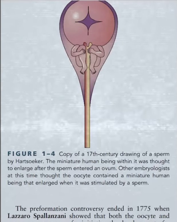 -كان ماء المرأة يغذي مني الرجل لأن به جنين قزم صغير داخل المني وهذا الجنين كان سيكبر ليصبح انسان النظرية المعروفة ب preformationism وتلك الفكرة ظلت في العالم لمدة القرن الثامن عشر وطبعا هذا هراء