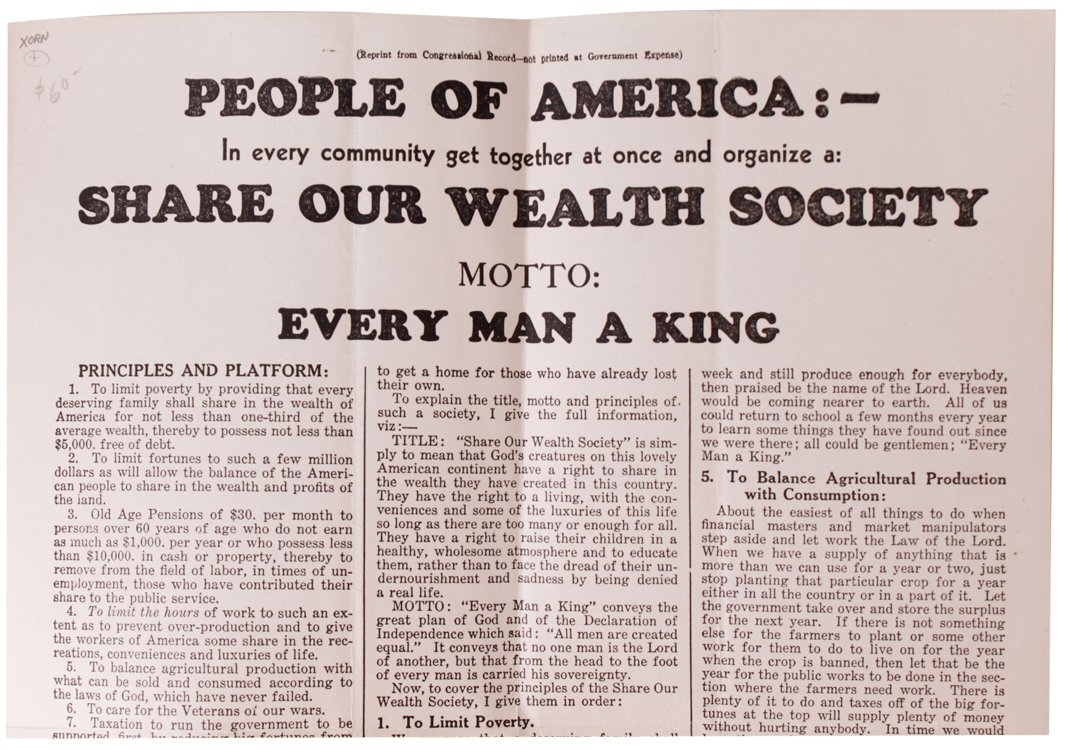 Il 23 febbraio 1934 il senatore Huey Pierce Long della Louisiana svela "Share Our Wealth", un piano che prevede la confisca di tutte le fortune personali che superano i cinque milioni di dollari e un'imposta sul reddito sui guadagni annuali oltre il milione di dollari.