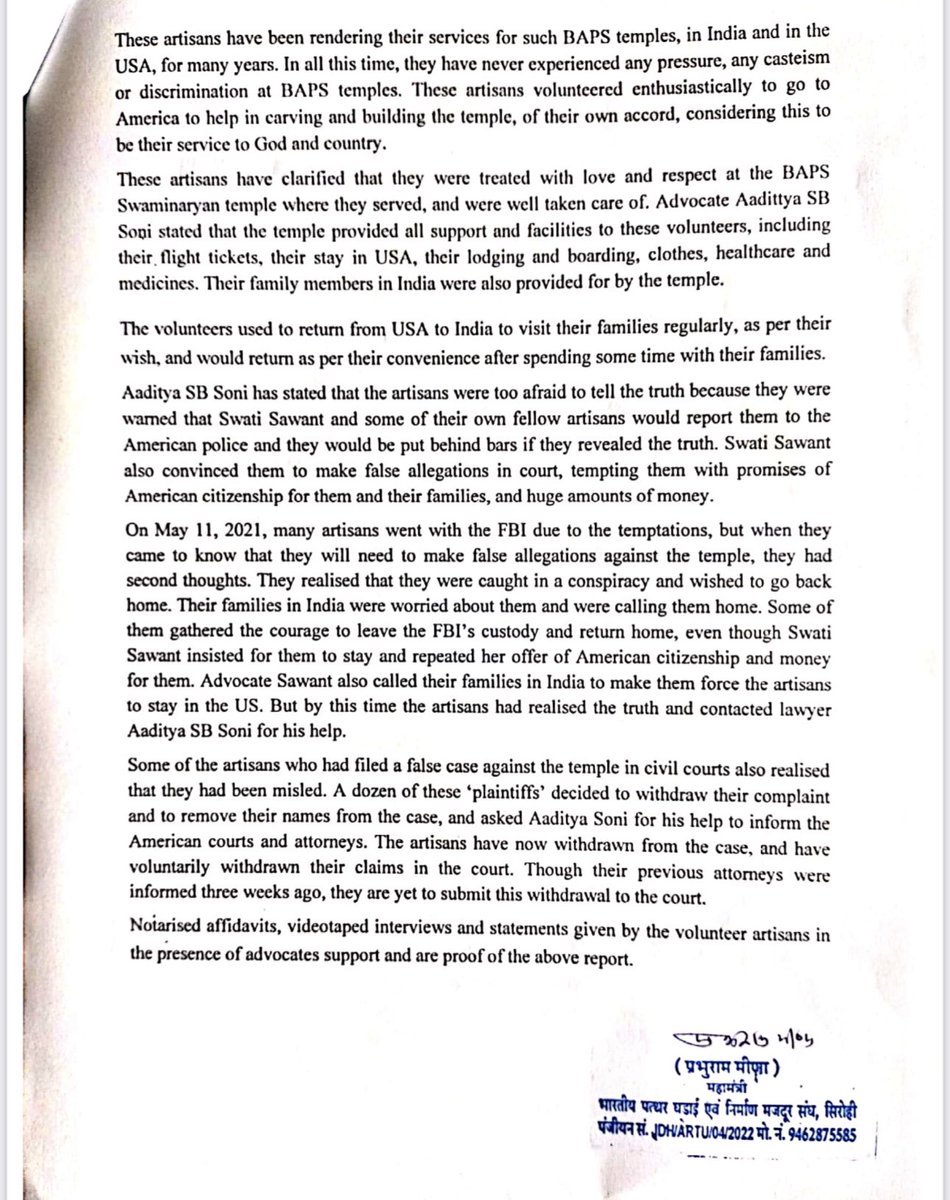 6/n: These artisans have clarificd that they were treated with love and respect at the BAPS Swaminaryan temple where they served, and were well taken care of. Advocate Aaditya SB Sopi stated that the temple provided all support and facilities to these volunteers, including their,…