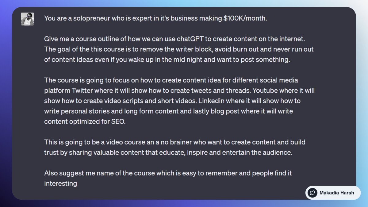 I received 10+ course names from ChatGPT and ultimately chose contentgptcourse.com.