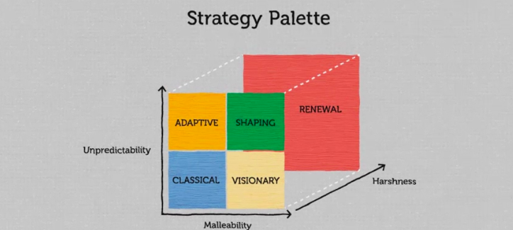 النهج التكيفي: يوصي المؤلفون باختيار هذا الأسلوب عندما لا تكون بيئة الأعمال قابلة للتنبؤ أو قابلة للوضوح. إن التخطيط بعيد المدى والقدرة على البناء في هذه البيئة يشبه وضع كل البيض في سلة واحدة ، وهو أمر يمكن أن يعرض مستقبل الشركة للخطر لأن بيئة الأعمال تتغير بسرعه