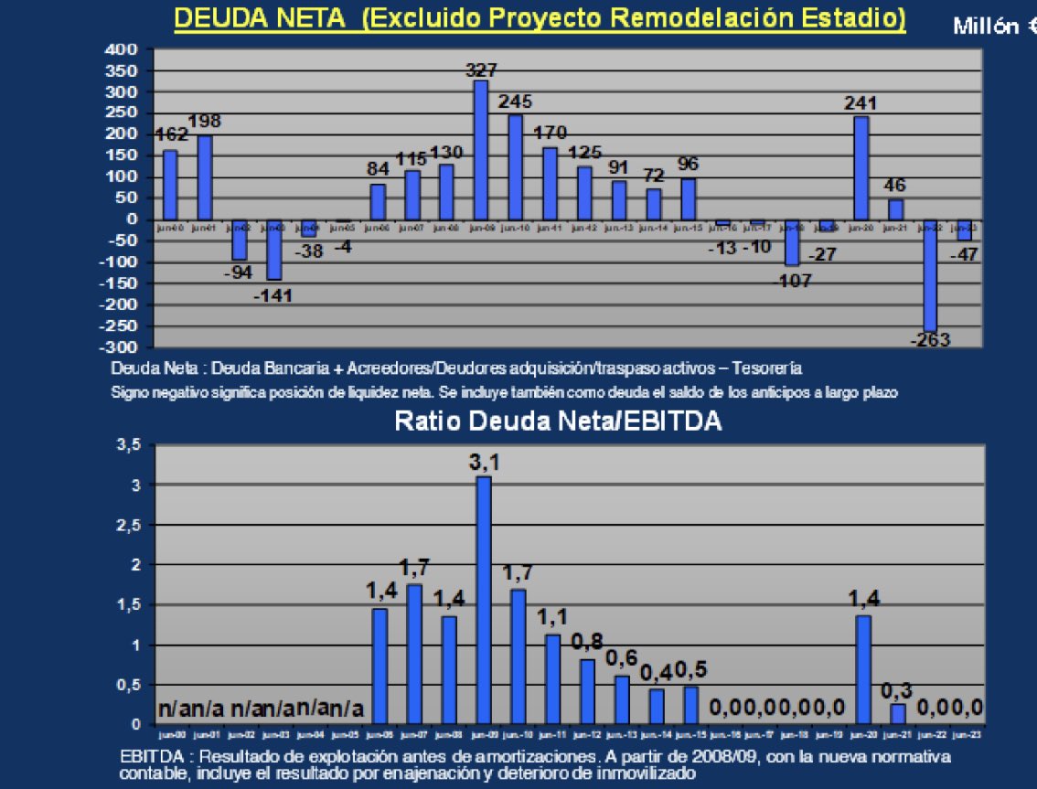 بلغ صافي ديون النادي ، باستثناء مشروع إعادة تصميم الاستاد ، -47 مليون يورو اعتبارًا من 30 يونيو 2023. ويمثل هذا المبلغ ، في الواقع ، ليس دينًا ، بل مركز سيولة صافٍ ، كمجموع للخزينة والمدينون للتحويلات أكبر من الأرصدة الدائنة للاستثمارات وديون البنوك والسلف.