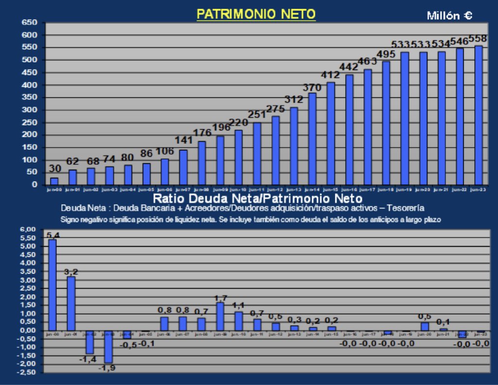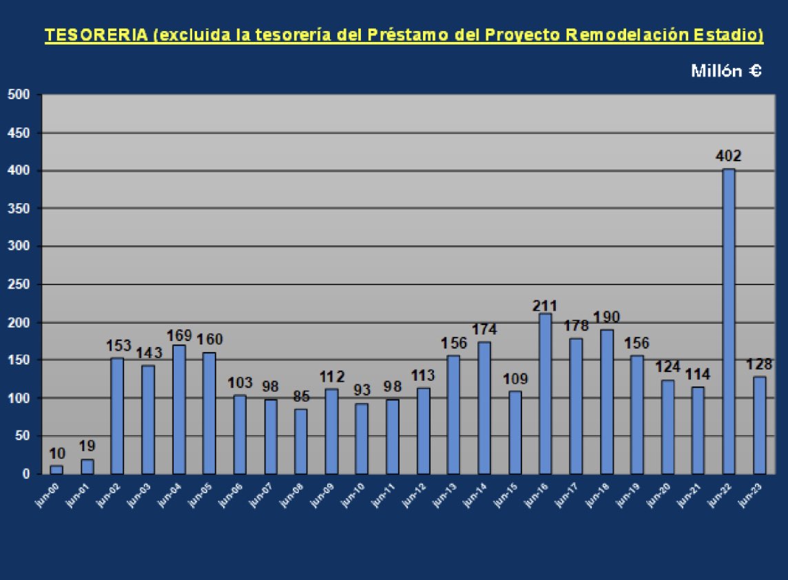 بلغ الرصيد النقدي في 30 يونيو 2023 ، باستثناء الأموال النقدية من قرض مشروع إعادة تصميم الاستاد ، 128 مليون يورو.