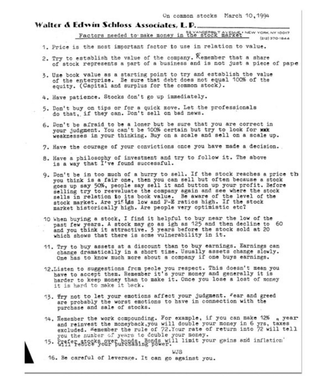 اعتقد شلوس أيضا أنك لا تستطيع معرفة الاستثمار إذا كنت تتابعه من قوائم المفضلة.