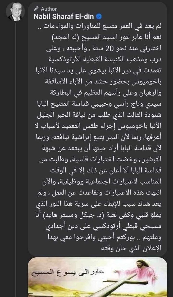 أعلن الصحفى المصرى نبيل شرف الدين أنه كان كافرا بالاسلام وتم تعميده فى الكنيسةبواسطة الانباشنودة منذ 20عاما