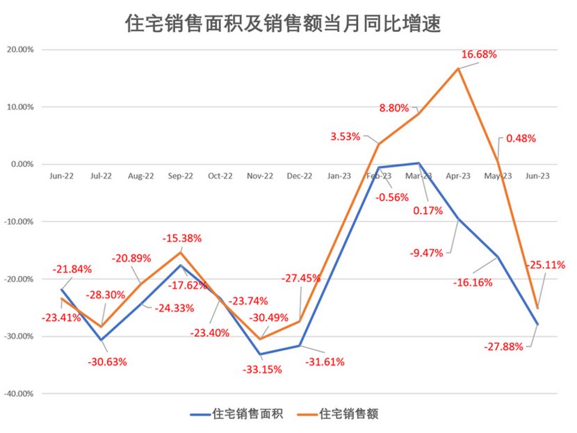 如果直接用原始数据,我们会看到惊悚的一幕。根据统计局自己的历史数据对比,简单的除法可以得知,上半年,全国累计住宅销售面积下降11%,累计销售额下降1.8%。销售额下降幅度小于销售面积,很可能是住宅销售中一线城市的占比急剧增加,而不是总体价格上涨。