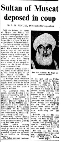 وفي كتابه“ لصوص التاريخ” يقول إيان كوبين“إن وزارة الخارجية البريطانية أثناء الإعداد لخطة الانقلاب سربّت للصحافة أنّ السلطان سعيد ينوى التنازل عن السلطة” وقامت بعض الصحف بنشر الخبر كهذا الخبر قبل الانقلاب بشهر 👇🏻
