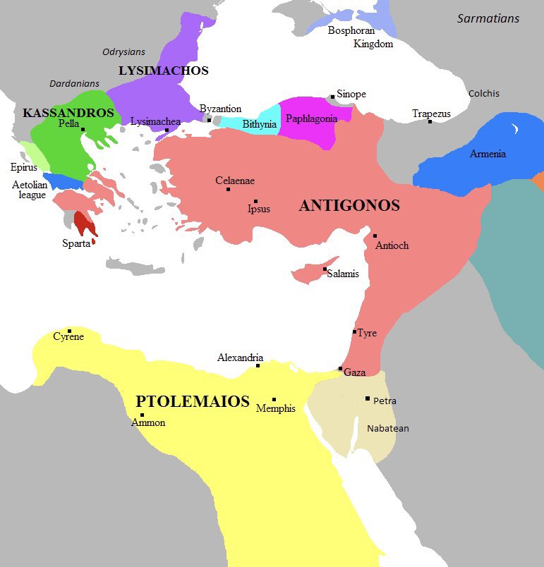 سعى أنتيغونوس (أحد خلفاء الإسكندر) بعد سيطرته على الشام إلى إخضاع الأنباط؛ غالبا للتحكم بطرق التجارة القادمة من الجنوب التي جعلت الأنباط من أغنى قبائل العرب وفق المؤرخ ديودور