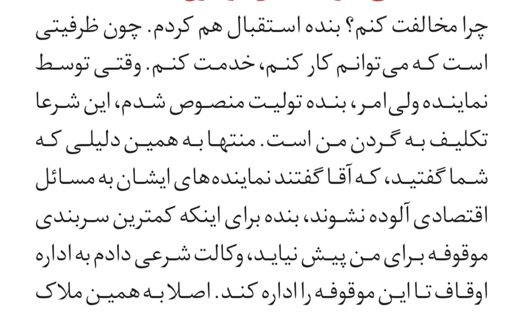 ۱۲. برای اینکه بفهمید جمهوریت در این مملکت به کجا رسیده و از نهج البلاغه که قرار بود مبنای حکومت دینی باشد بخصوص آنجا که مولا میگفت حاکمان به جز اسرار جنگی و نظامی وظیفه دارند همه امور حکومتی را با مردم شفاف کنند به کجا رسیدهایم چند بند آخر این مصاحبه را حتما بخوانید.