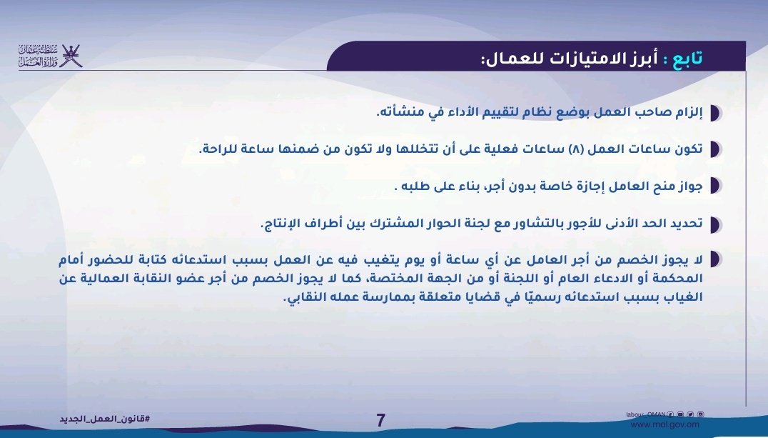 #أثير| يعتبر #قانون_العمل نتاجا لأعمال أطراف الإنتاج الثلاثة، وهي الحكومة (وزارة العمل) والعمال (الاتحاد العام لعمال سلطنة عمان) وأصحاب العمل (غرفة تجارة وصناعة عمان). وتم عقد ورش عمل عديدة بهدف مشاركة المعنيين في إعداده.