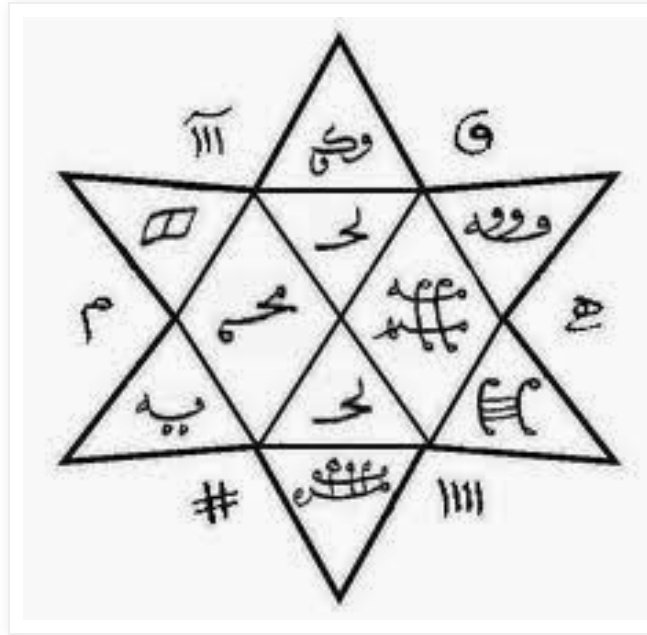 وكان رمز الذكر القديم يمثل بشكل مثلث رأسه للأعلى كرمز للعضو الذكري ، ورمز الانثى كان بشكل مثلث متجه للأسفل.. وباجتماع الرمزين أي باتحاد الذكر والانثى ينتج الهيكساغرام أو النجمة السداسية