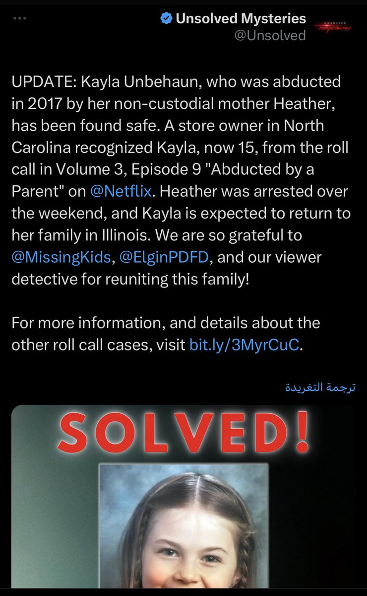 الطفلة "كايلا" اختفت في عام 2017 وتم العثور عليها في عام 2023 بسبب "ان أحد الأشخاص تعرف على الفتاة "كايلا" (15 عاما) في أحد محال المدينة، وكان من متابعي "ألغاز لم تُحل" في منصة نتفلكس ، وتلقت الشرطة بلاغا من موظف بالمحل