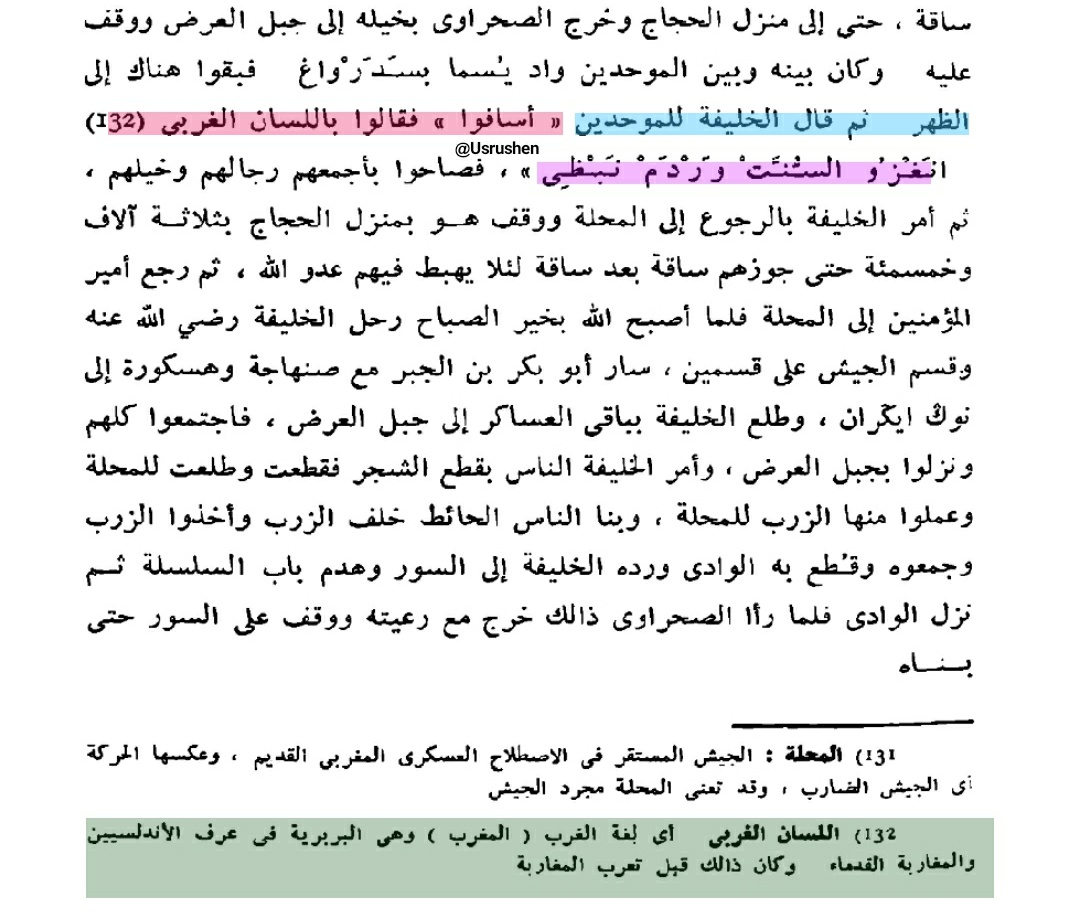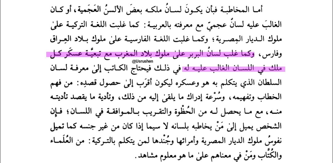 ▪︎فيقول عن لسان ملوك المغرب :"" كما غلب #لسان_البربر على ملوك #بلاد_المغرب مع تبعية عسكر كل ملك في اللسان الغالب عليه له في ذلك فيحتاج الكاتب إلى معرفة لسان السلطان الذي يتكلم به هو وعسكره ليكون أقرب إلى حصول قصده من فهم الخطاب ، وتفهيمه وسرعة إدراك ما يلقى إليه من ذلك""
