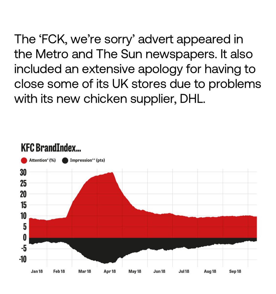 عندما واجه مطعم KFC في المملكة المتحدة عام 2018 مشكلة في تلبية جميع وجبات زبائنهم واضطر لإغلاق 900 نقطة بيع، انضمّت KFC مع معجبيها للسخرية من مشكلتها على مواقع التواصل الاجتماعي.