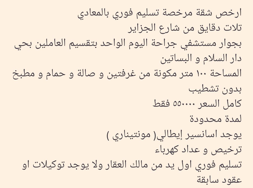انا روحت شوفت الشقة دي بعيني في قلب قلب وفي شارع جميل كله شجر وتحفة وصاحبها كان مستعد يخلص بـ٥٠٠ الف بس