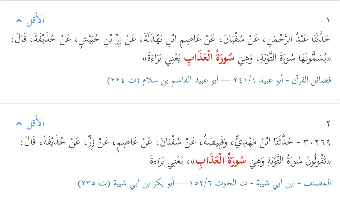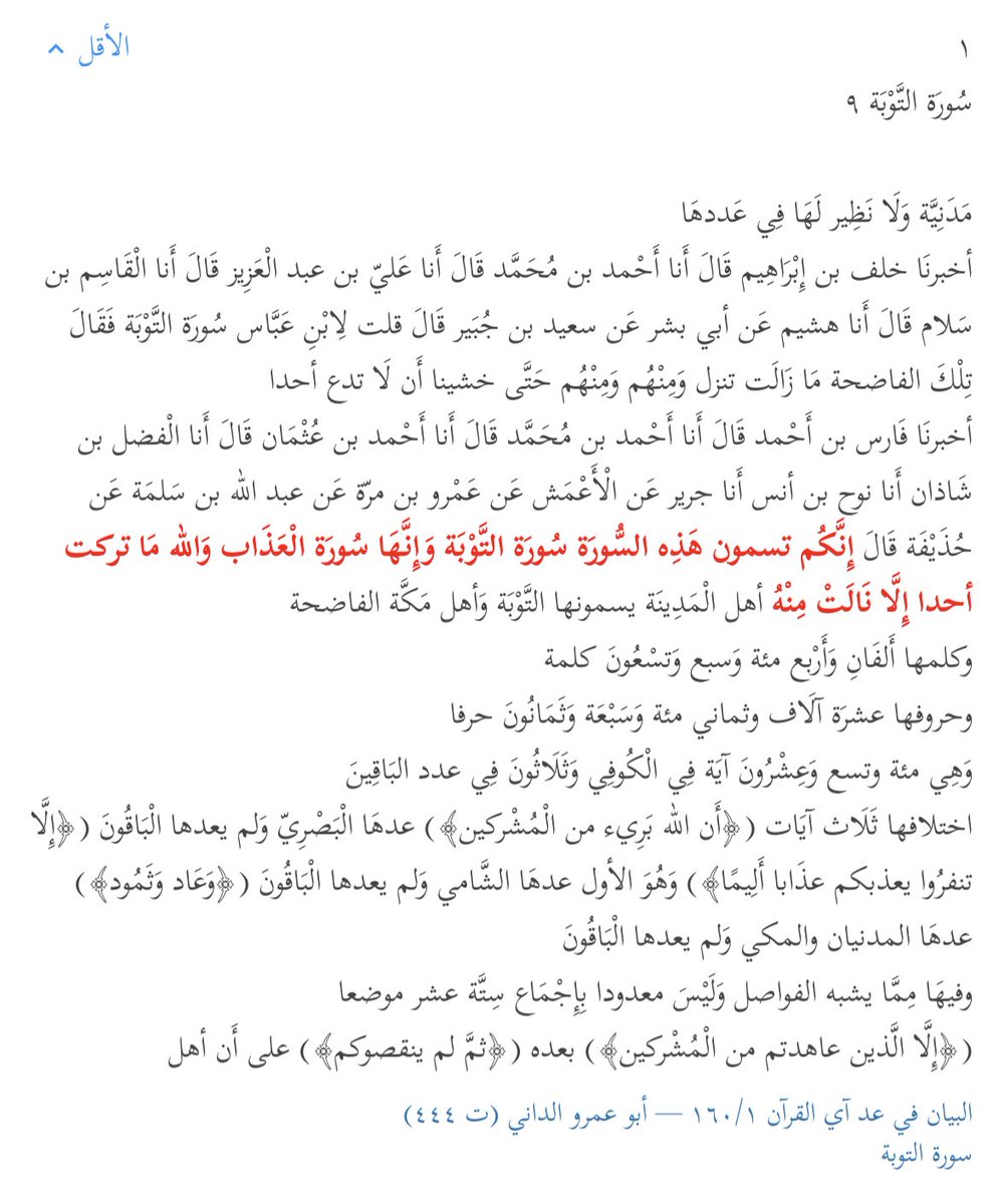 الناس يسمونها التوبة، ولكن حذيفة كان يسميها «العذاب»، وابن عباس يسميها «الفاضحة».