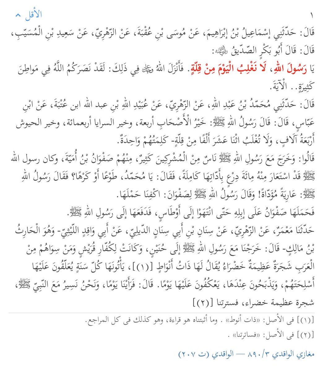 💠الاغترار بالكثرة كان في غزوة حنين (٨ هـ)، كأن المسلمين لم ينتصروا من قبل وهم قليل، لكن طبيعي أن يغتر بالكثرة من لم يطعن بسيف ولا برمح وقت القلة.