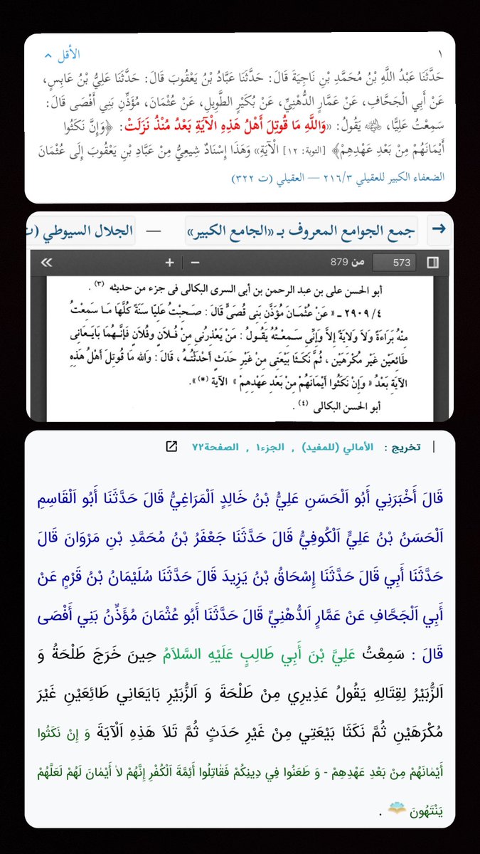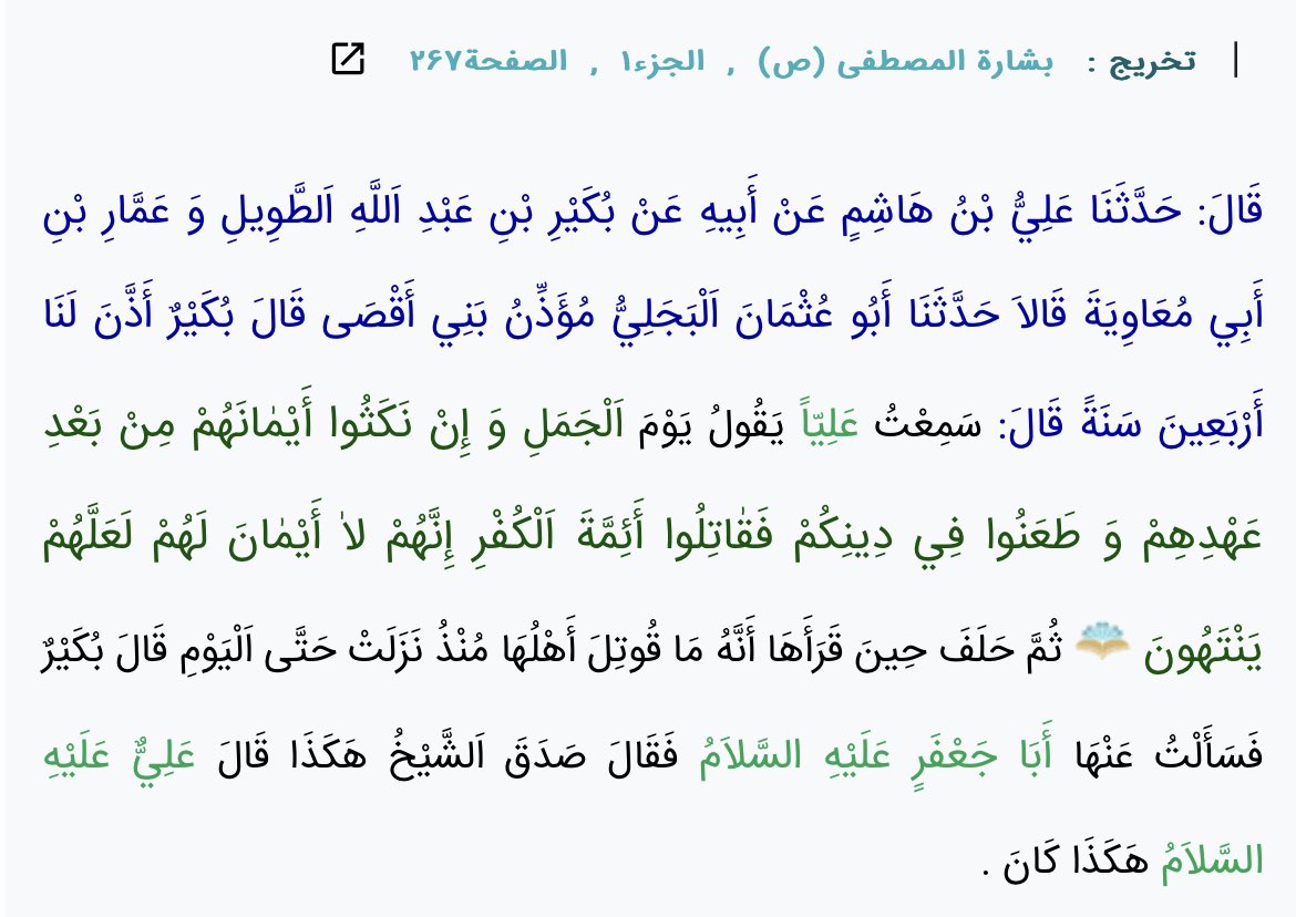 لذلك كان أمير المؤمنين (ع) يقرأ هذه الآية يوم الجمل، وأن أهل هذه الآية بدأ قتالهم أخيراً في ذاك اليوم، وأنه سيحارب بعدهم القاسطين والمارقين كما أخبر بذلك النبي ﷺ.