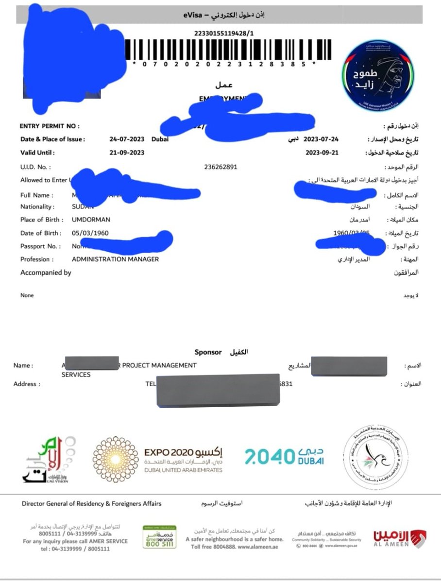 ◽ اجراءاتها بتتم في الامارات (فحص طبي / البصمة / كرت الاقامة ) مابتحتاج تعمل اجراء في السودان غير انك تسافر
