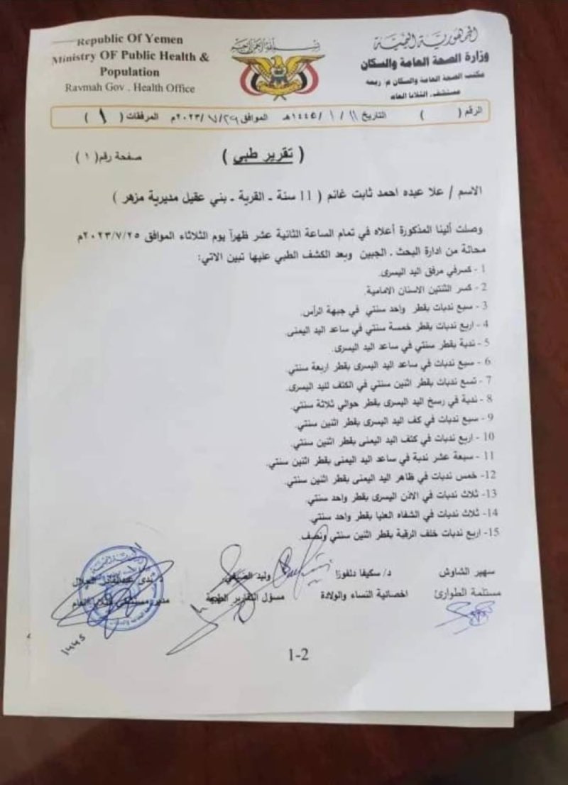 طفلة علا يمنية تبلغ من العمر 11 عاما وتعرض لتعذىِب أسري ومعاملة وحشية على يد والدها وأقاربها، قبل قيامهم ببيعها بمبلغ 200 ألف ريال يمني أي حوالي 140 دولارا كجارية
