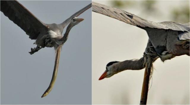 صورة مرعبة لثعبان بحر يتدلى من رقبة طائر مالك الحزين وهو شيء لا نراه كل يوم