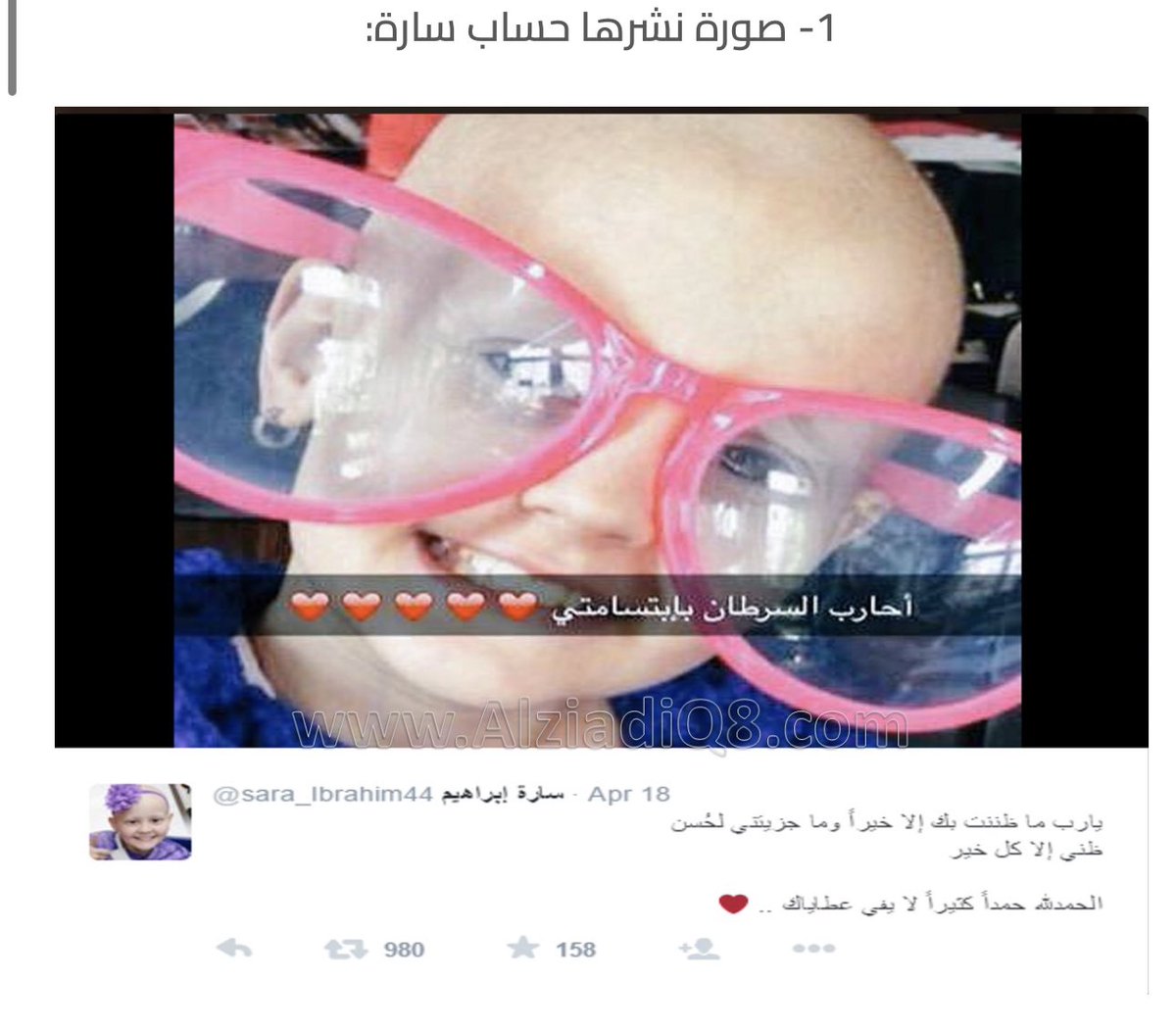 وإستغل صور عديدة لطفلة أمريكية تدعى Esme كانت تتعالج من السرطان حيث كان والدي الطفلة الأمريكية يقومان بتصوير مراحل علاج أبنتهم وينشرون الصور على حساب الطفلة على الفيسبوك وتويتر ومدونة خاصة.. فهي طفلة أمريكية وأسمها ليس سارة إبراهيم وأغلب الصور التي شاهدتموها على تويتر كانت في…