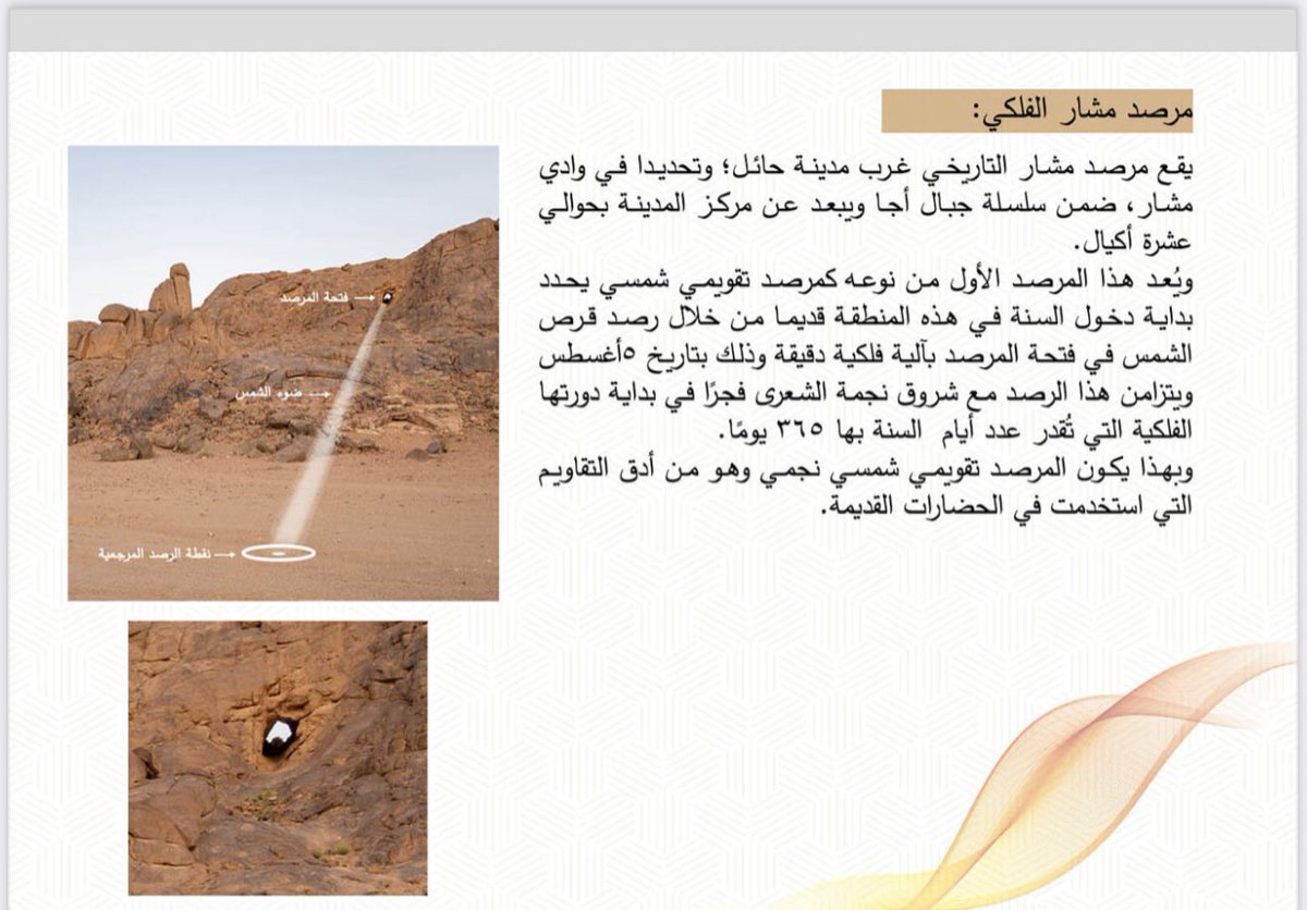 يقع مرصد مشار التاريخي غرب مدينة حائل؛ وتحديدا في وادي مشار، ضمن سلسلة جبال أجا ويبعد عن مركز المدينة بحوالي عشرة أكيال. ويُعد هذا المرصد الأول من نوعه كمرصد تقويمي شمسي يحدد بداية دخول السنة في هذه المنطقة قديما من خلال رصد قرص الشمس في فتحة المرصد بآلية فلكية…