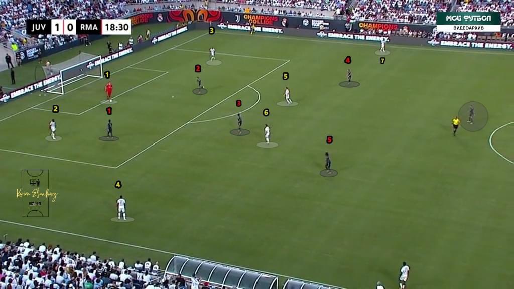 امبارح في مباراة اليوفي طرأ على هيكل ضغط مدريد بعض التعديلات، أبرزها عدم صعود الأظهرة للضغط على أظهرة الخصم في محاولة لمعادلة عدد لاعبي الخصم في التلت الدفاعي 4v4 مع وجود كروس كلاعب إضافي للتغطية ومحاولة كسب الكرة التانية!