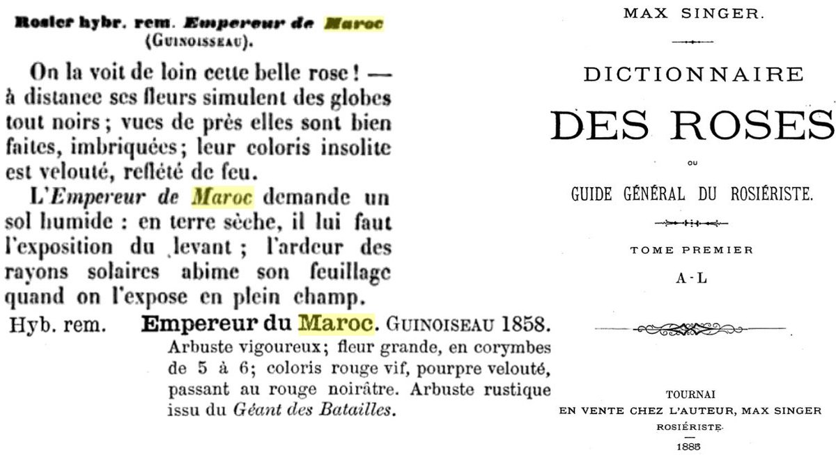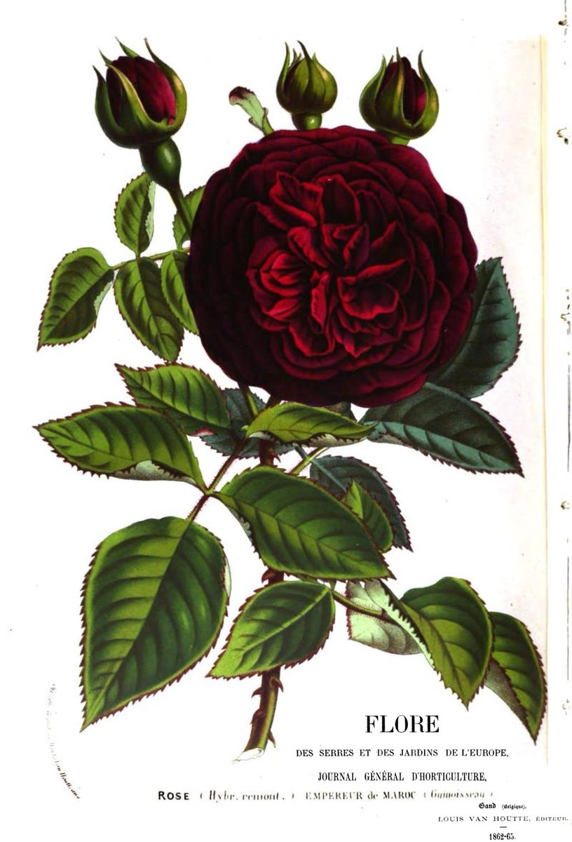 توجد وردة تحمل إسم إمبراطور المغرب واحدة من الورود الهجينة التي عرفت وطوّرت من طرف البستاني Guinoiseau عام1858. وتتميز هذه الوردة باللون الأحمر البنفسجي الدّاكن عموما. ويتطلب إنبات ساق وعروش هذه الوردة تربة ذات رطوبة عالية ولكن داخل أرض جافة.