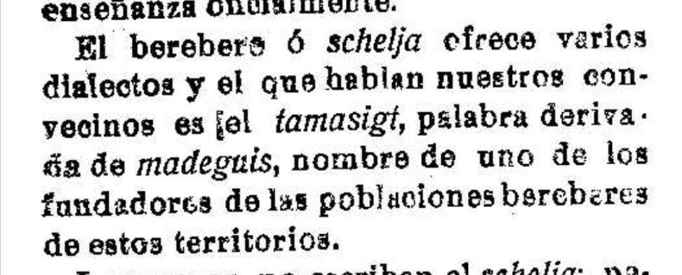 ▪︎و نلاحظ استعماله لفظ المور للإشارة للمغاربة الامازيغ حيث يقول عن مشكلة الكتابة :""إن #الموريون لا يكتبون الشلحة ولكن من أجل تعليمها يتعين نقل أصواتها بالإسبانية أو بالعربية حيث من خلال هاتين اللغتين يمكن التعبير على أصواتها الحلقية والتنفسية القوية بسهولة"".