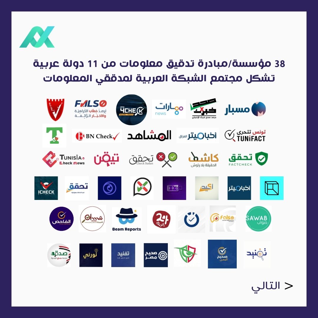 🟢 خلال عامين, توسع مجتمع الشبكة العربية لمدققي المعلومات، وأصبح يضم 38 مؤسسة ومبادرة تدقيق معلومات من 11 دولة عربية. فخورون بكل هذه المؤسسات، ونتطلع إلى العمل معاً مستقبلاً؛ لتطوير تدقيق المعلومات، وزيادة الوعي به بين الصحفيين والصحفيات والجمهور بشكل عام.