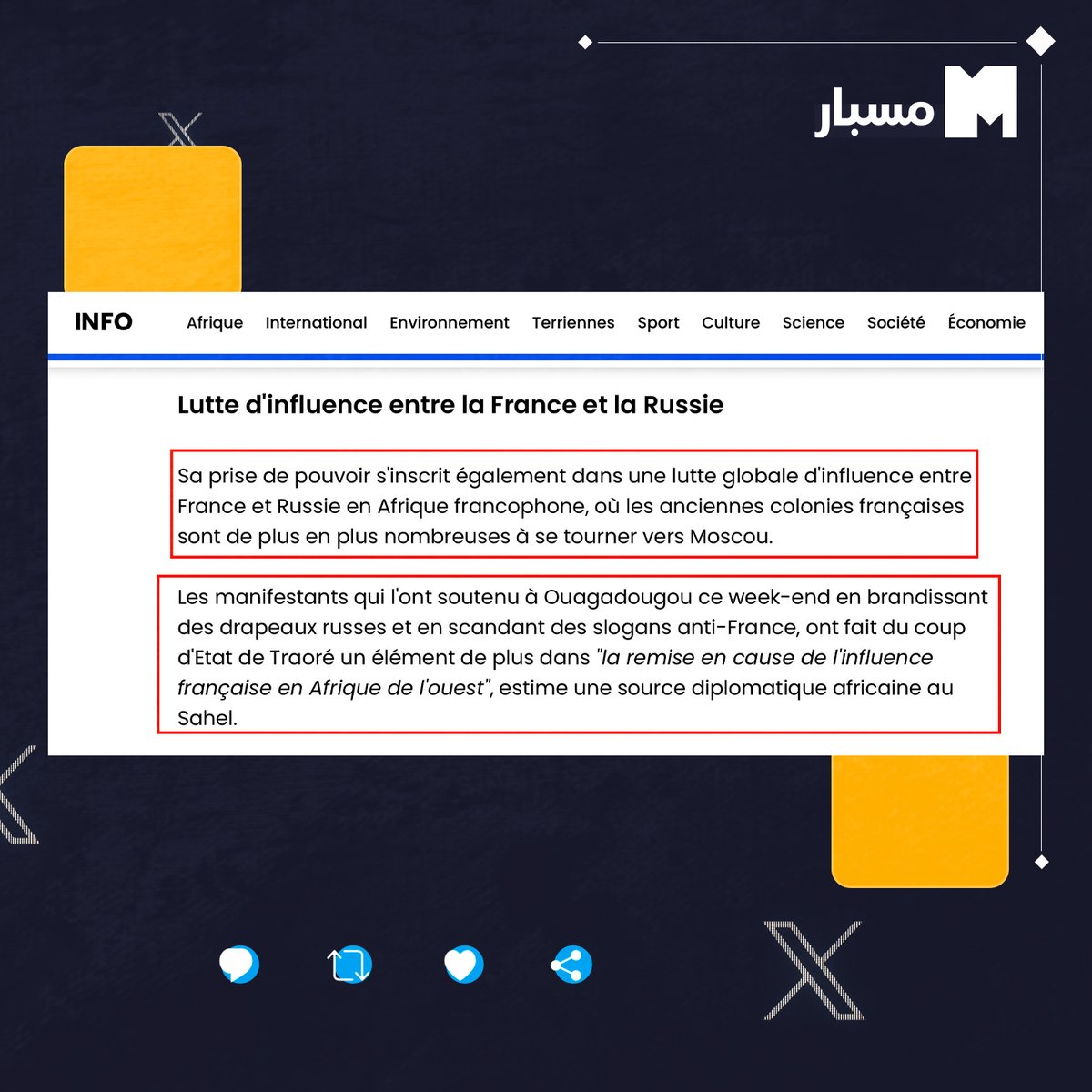 📌 في تقرير مشترك مع وكالة الصحافة الفرنسية، قال موقع TV5MONDE إن انقلاب تراوري يندرج ضمن “صراع دولي على النفوذ في أفريقيا الفرنكوفونية بين #روسيا وفرنسا”، وإن عددًا متزايدًا من المستعمرات الفرنسية القديمة ينجذب نحو موسكو.